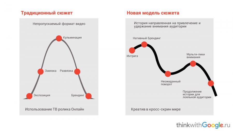 Меняется модель сюжета — на смену традиционной арке, которая устаревает в мире нескольких экранов, приходит мультипиковая кривая. Она начинается с интриги и благодаря неожиданным поворотам удерживает внимание зрителя.