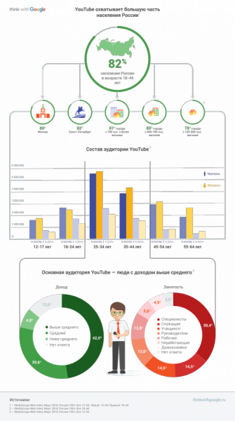 По данным Mediascope, YouTube охватывает 82% населения России. При этом на видеохостинге представлен самый разный контент — от роликов DIY (Do It Yourself, «Сделай сам») до новостных трансляций, обзоров устройств, косметики и не только. Каждый рекламодатель может найти на YouTube релевантные группы ЦА и выстроить с ними эффективную коммуникацию.