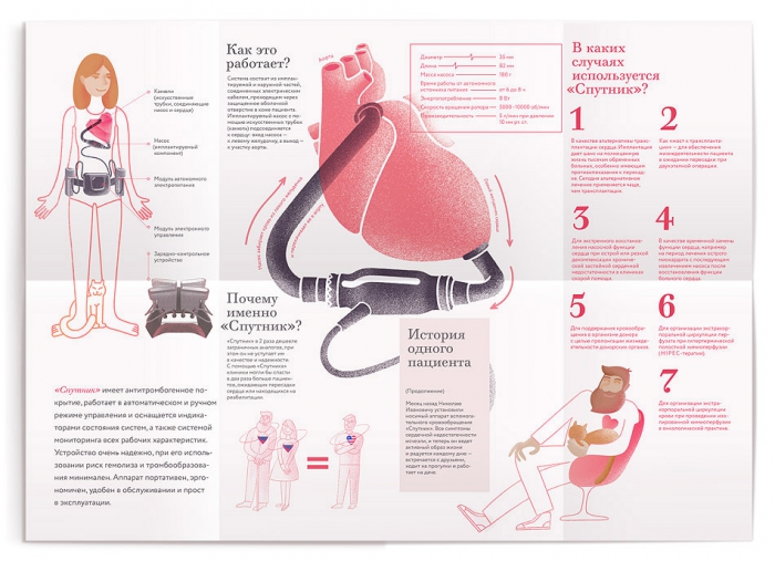 Студия Артемия Лебедева разработала логотип и фирменный стиль для «Спутника» - носимого аппарата вспомогательного кровообращения (АВК-Н), созданного командой российских ученых. Он улучшает насосную функцию левого желудочка сердца у больных с тяжелыми формами сердечной недостаточности.