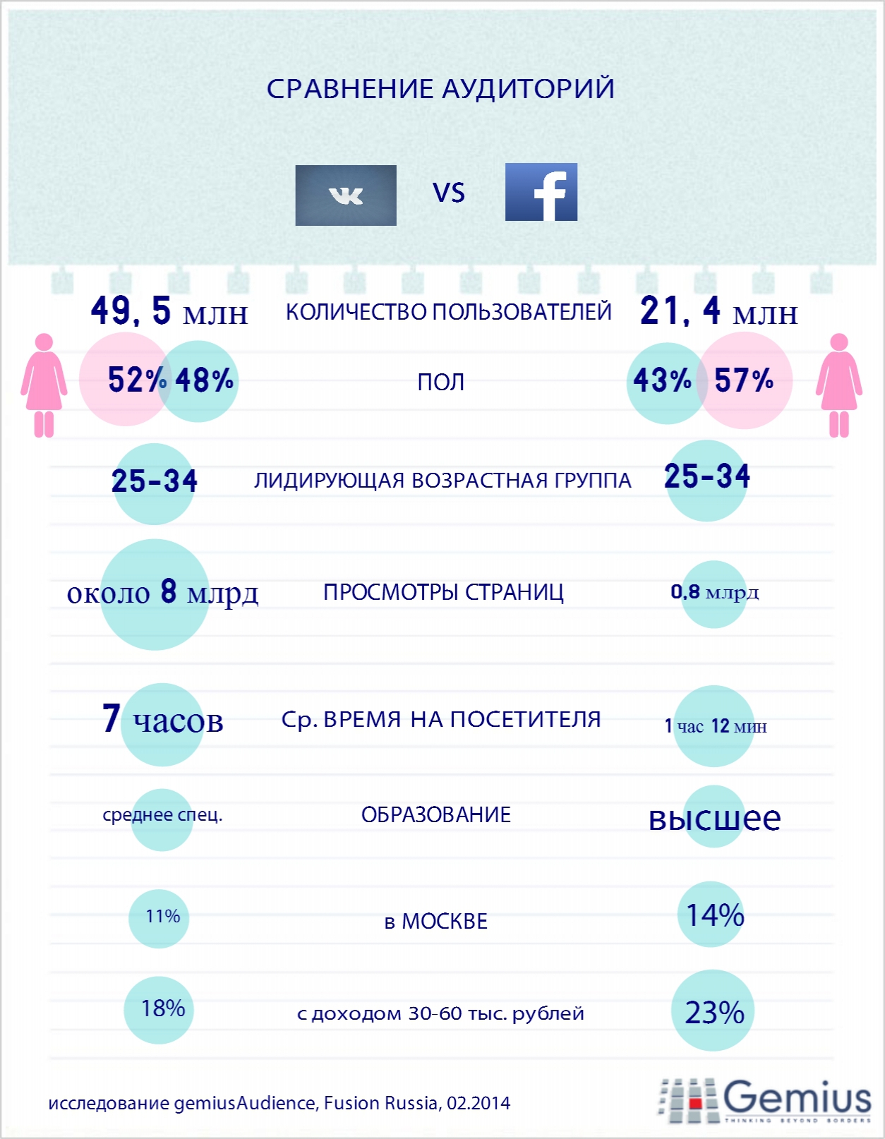 Распределение аудитории по полу как соцсети "ВКонтакте" (VK.com), так и Facebook почти одинаково – и там и там, количественно, преобладают женщины. Большинство пользователей обеих соцсетей - это люди в возрасте 25-34 лет.