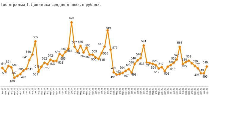 Среднестатистический российский горожанин за один поход в магазин потратил в сентябре 519 рублей, что на 4,8% больше, чем месяцем ранее. Таким образом, полугодовой тренд по снижению величины среднего чека оказался прерван, сообщается в исследовании «Ромир».