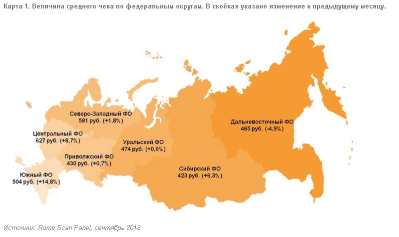 За месяц средний чек прибавил почти повсеместно, если говорить о макрорегионах страны. Исключение составил только Дальневосточный округ, где чек похудел на -4,9%. Более всего чек прибавил на юге страны (+14,8%), в центре (+8,7%) и в Сибири (+6,3%). Росту чека в Центральном ФО способствовали единоразовые траты москвичей, которые в сентябре выросли сразу на 6,7% — с 675 рублей в августе до 720 рублей в первом осеннем месяце. Годовой рост чека в столице тоже оказался заметным и составил 5,3%. Чек в Питере оказался на отметке в 668 рублей, однако в разрезе года он немного сдал позиции, сократившись на 1,3% с 677 рублей.