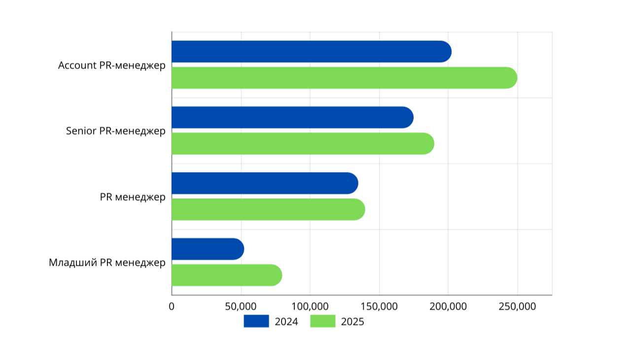 Средняя зарплата у младших PR-специалистов выросла за год с 52,5 до 80 тыс. руб., у Middle PR-менеджеров — с 120−150 до 130−150 тыс. руб. Senior PR-менеджерам в прошлом году предлагали зарплаты в размере 170−180 тыс. руб., в этом году —180−200 тыс. руб. Account PR-менеджеры годом ранее зарабатывали 195−210 тыс. руб., сейчас — 250 тыс. руб.