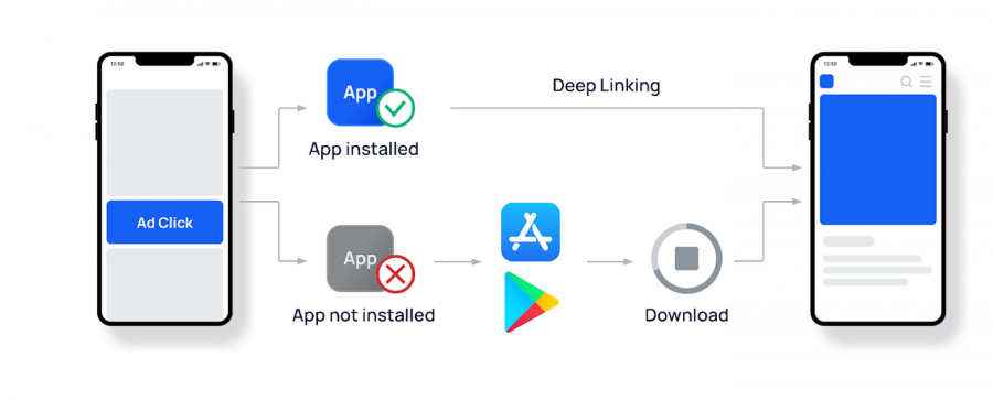 Реклама в мобильных приложениях, в свою очередь, чаще всего ведет в другие мобильные приложениях (app-to-app), а не на сайт. При таком подходе переадресация с рекламного объявления происходит непосредственно в приложение рекламодателя, если оно уже установлено у пользователя, либо в магазин приложений, где пользователь может его загрузить. Post-click эффективность размещения в данном случае оценивается в системах аналитики мобильных приложений, post-view — в системах трекинга и верификации, при наличии интеграции и дополнительной настройки соответственно.