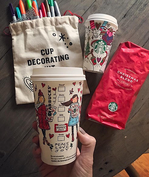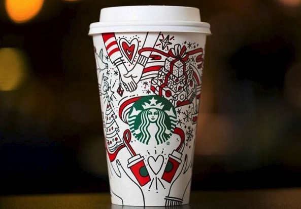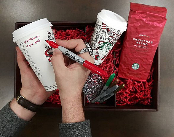 Акция приурочена к Рождеству и Новому году. На этот раз сеть кофеен предложила своим гостям стаканчики с белым фоном и черно-красным рисунком, на которых покупатели могут сами отобразить свое Рождество.