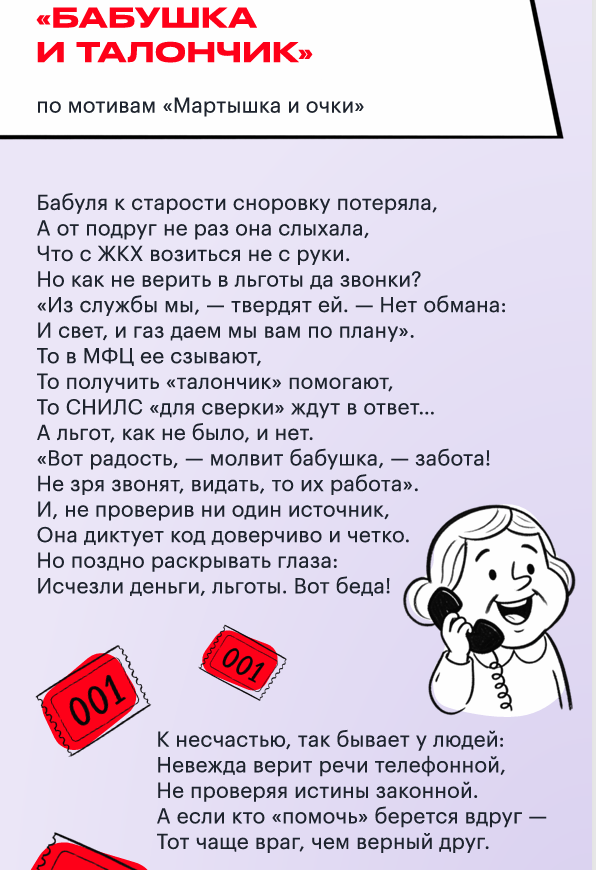 Онлайн-кинотеатр START совместно с народным фронтом против мошенничества «Мошеловка» и социальной кампанией по финансовому просвещению старшего поколения «Расскажи бабушке» представил «Сборник басен о схемах мошенничества». Проект призван напомнить людям старше 55 лет о самых частых схемах обмана и научить простым правилам безопасности. Об этом Sostav рассказали в пресс-службе START.