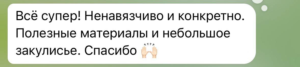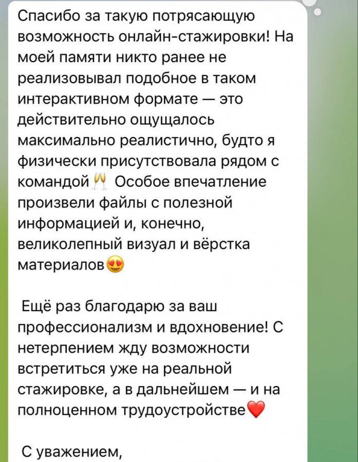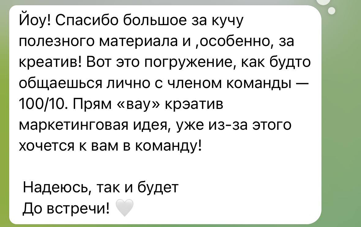 Для тех, кто успешно прошел онлайн-стажировку (выполнял задания вовремя), был создан отдельный чат, в котором участники знакомились и делились мнением о стажировке. Для тех, кто пропускал задания и не прошел бот до конца, мы подготовили экспертное видео от HRD на тему «Как пройти собеседование, чтобы получить оффер». Кроме того, у каждого пользователя при желании была возможность прислать резюме и портфолио.