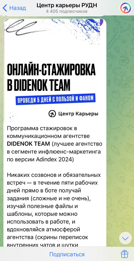 - в пабликах и внутренних чатах вузов, где регулярно читают лекции и преподают отдельные курсы сотрудники агентства;