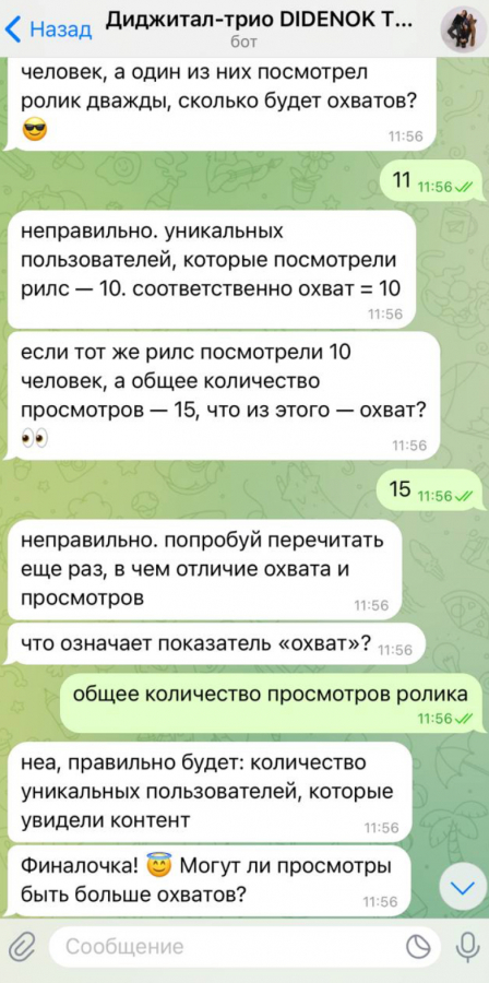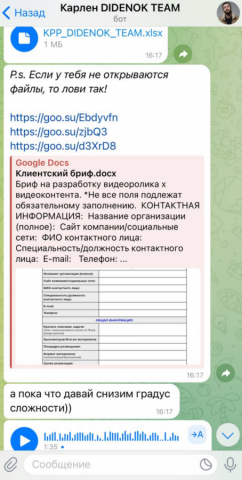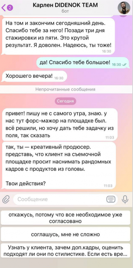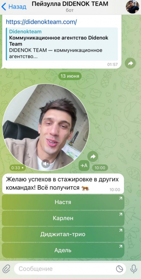 Мы разработали пятидневный чат-бот, который имитировал работу в разных отделах DIDENOK TEAM под руководством хэдов каждого направления: