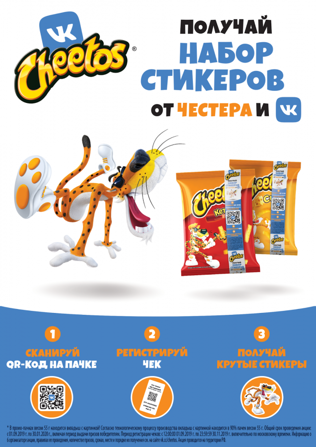 Для своего спецпроекта «ВКонтакте» Cheetos даже дополнили дизайн упаковки. На пачке появилась промолента с QR-кодом с логотипом социальной сети. Переходя по ссылке, зашитой в код, покупатели попадали в приложение «Чекбэк». Там они могли зарегистрировать чек из магазина и получить коллекционные стикеры с Честером.