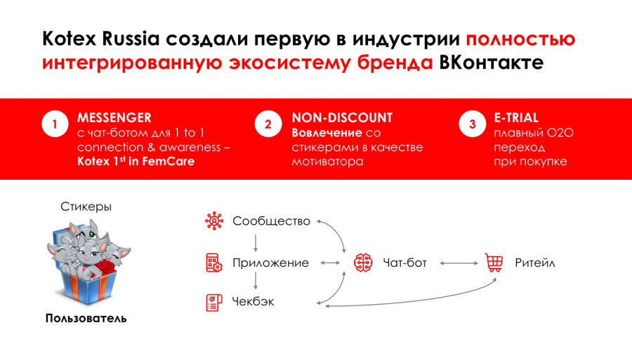 Kotex уже не первый год создаёт «ВКонтакте» полноценную платформу для общения с аудиторией. Напомним, в прошлом году бренд запустил собственного чат-бота, через которого пользователи «ВКонтакте» могли получить уникальный стикерпак и промокоды на продукцию.
