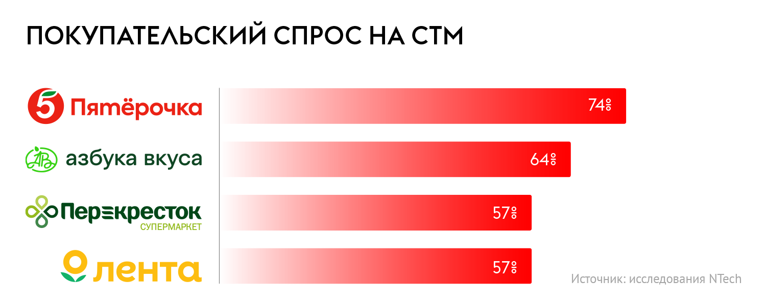 На первом месте среди тех, чьи товары под СТМ активно приобретают покупатели, по состоянию на конец года была «Пятёрочка» (74% её покупателей в числе прочего выбирают и товары собственных торговых марок). Далее следует «Азбука вкуса» — 64%, «Лента» и «Перекрёсток» — по 57%.