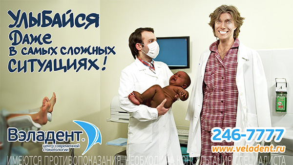 Наружная реклама стоматологического центра содержала надпись «Улыбайся даже в самых сложных ситуациях!» и изображение родителей европейской внешности с новорожденным темнокожим ребенком. Представители «ВэлаДент» не согласились с мнением УФАС и утверждали, что реклама призывает оставаться оптимистом и решать проблему с улыбкой на лице.