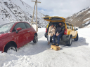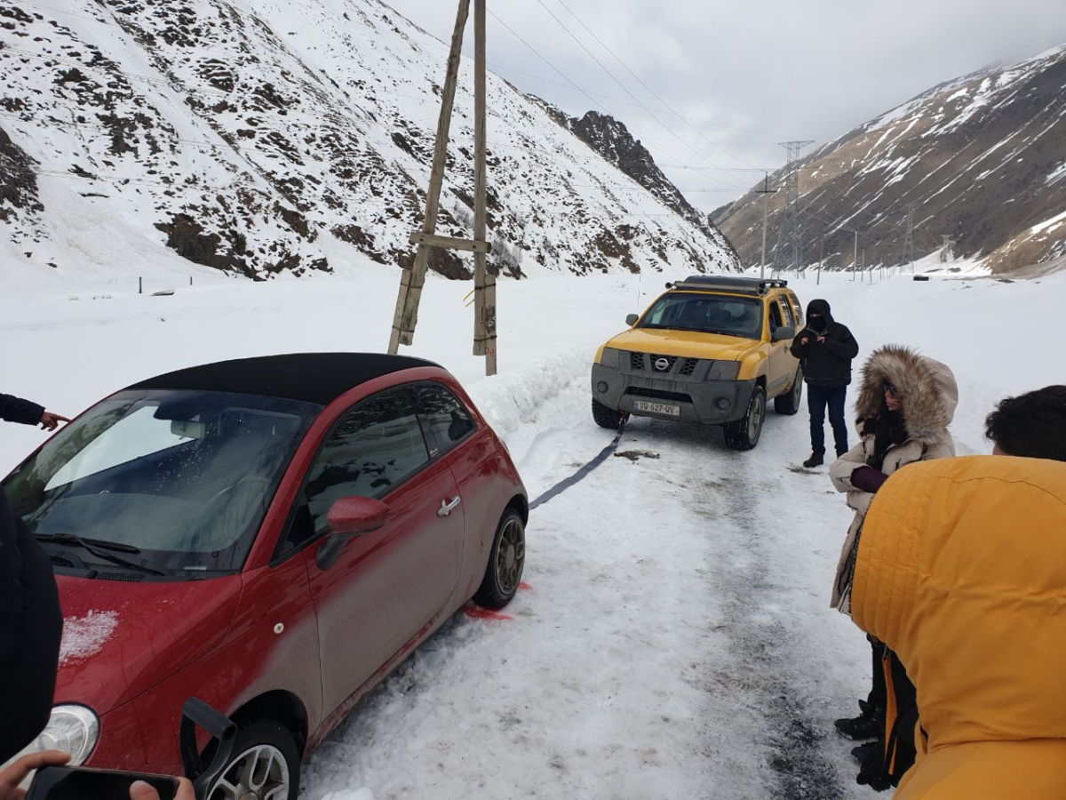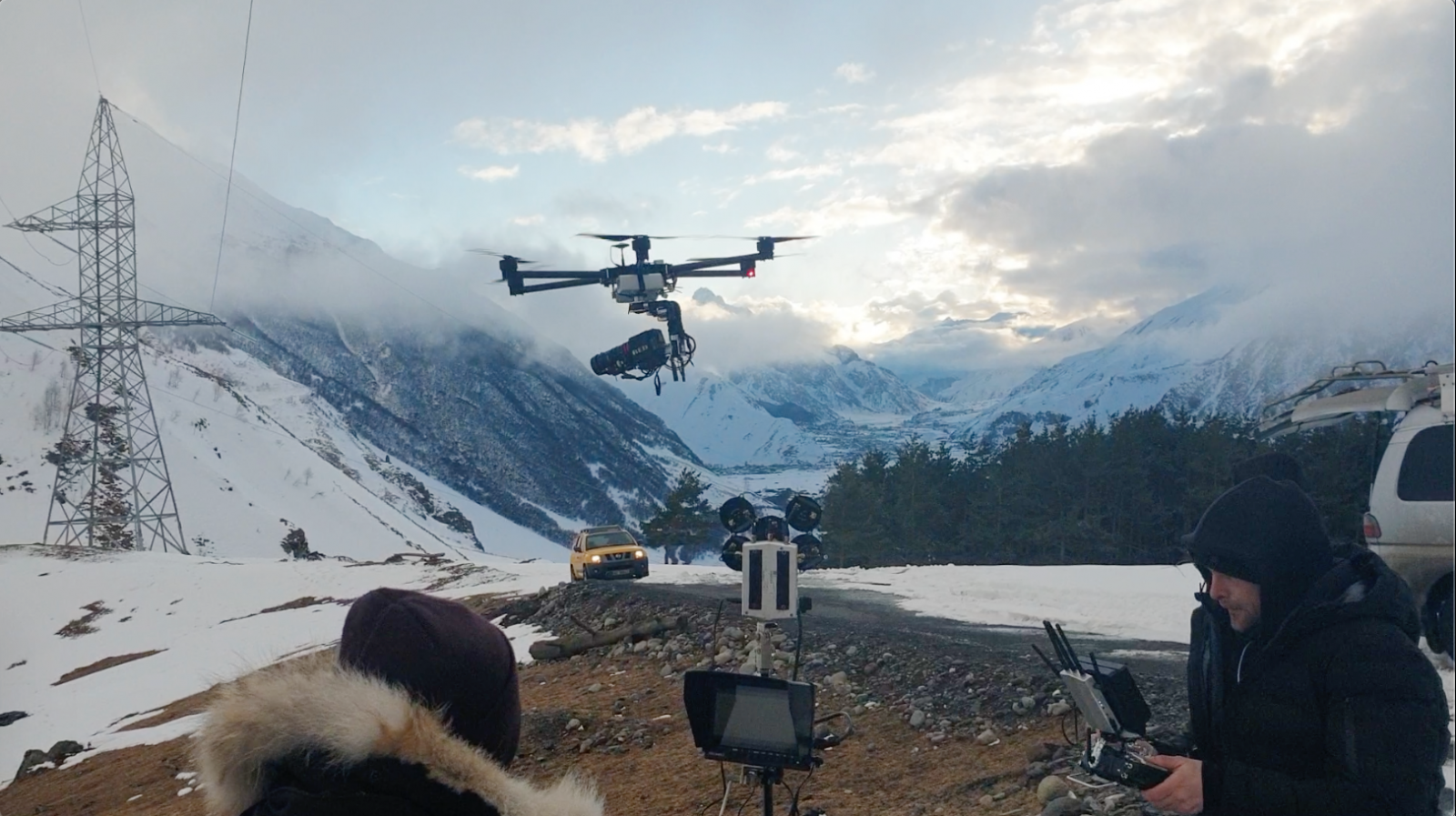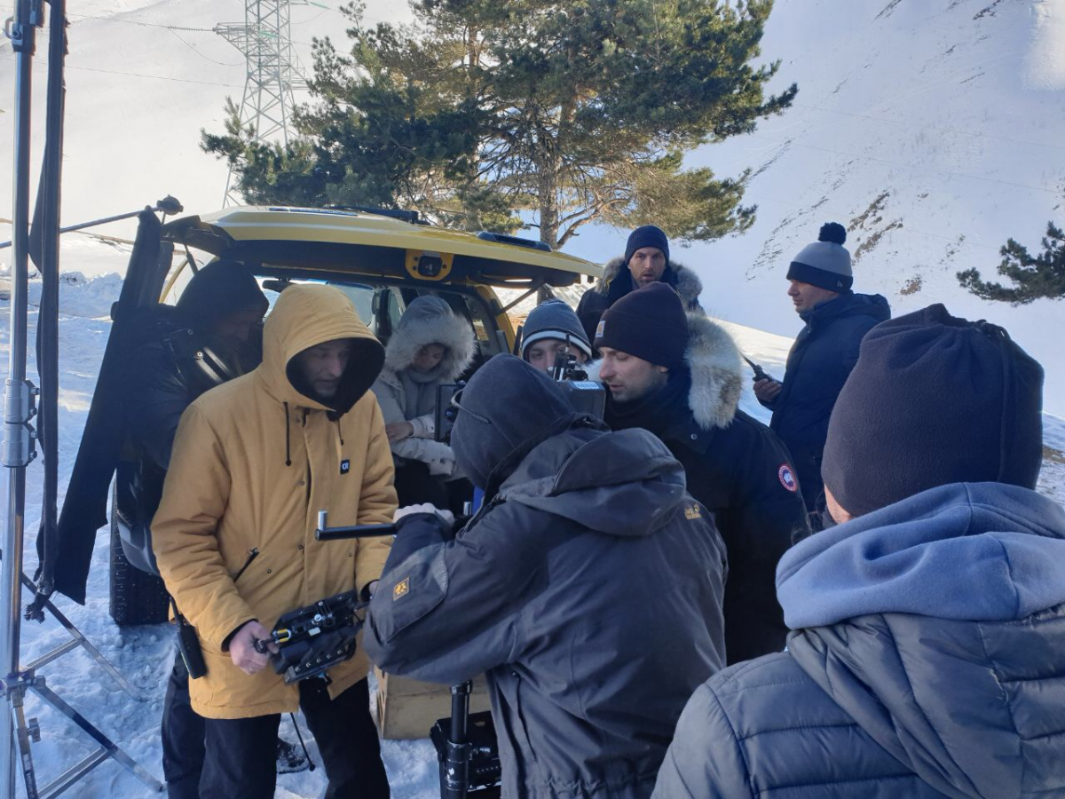 Съемки вышли очень масштабными. Почти 70 человек на площадке, две машины, работающие на износ, каскадеры, снегоуборочная техника, гексакоптер, камеры… Издали это смотрелось так, словно в Грузии решили снимать новую часть Лары Крофт, но почему-то с шинами Viatti.
