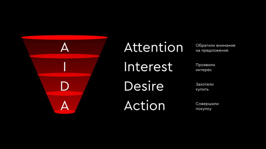 - attention (внимание) — самое широкое место воронки, здесь собираются все потенциальные клиенты, которые, например, обратили внимание на вывеску;