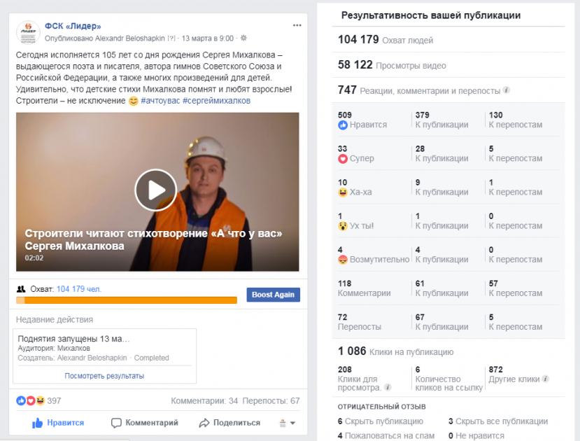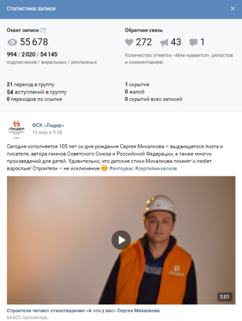 Основной целью рекламной кампании был охват. Соцсети сегодня любят видео и стимулируют органический охват, а с помощью рекламного продвижения корпорации удалось его значительно увеличить.