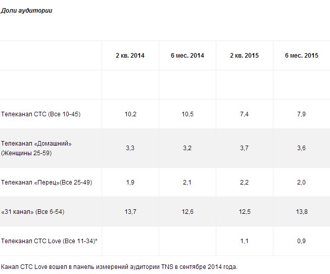 По данным TNS, в первом полугодии доля канала СТС в своей целевой аудитории «Все 10–45» снизилась с 10,5% до 7,9%. «Домашний», наоборот, нарастил долю целевой аудитории «Женщины 25–59» с 3,2% до 3,6%. Доля «Перца» («Все 25–49») снизилась незначительно (2% против 2,1%).