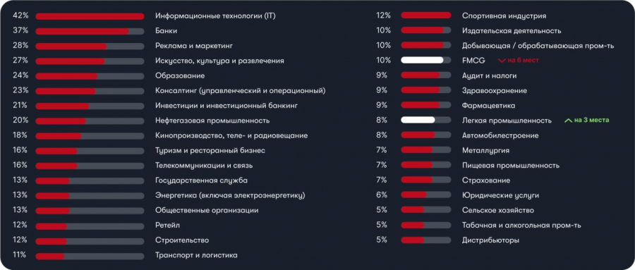 Самыми привлекательными отраслями среди студентов стали IT (42% участников опроса хотели бы работать в этой отрасли), банки (37%), реклама и маркетинг (28%), искусство, культура и развлечения (27%), образование (24%).