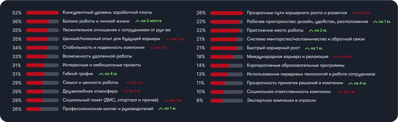 Студенты и выпускники вузов также рассказали, что ценят при устройстве на работу. Для половины респондентов важна зарплата, для 36% — баланс работы и личной жизни. По 35% опрошенных ценят уважительное отношение со стороны руководства и возможность приобрести полезный опыт для будущей карьеры. 31% назвал гибкий график работы, столько же респондентов отметили интересные и амбициозны проекты.