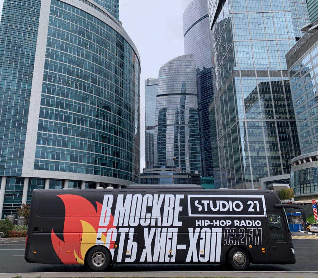 Один из самых молодых проектов «Европейской медиагруппы» — хип-хоп радиостанция STUDIO 21 — запустила имиджевую кампанию «В Москве есть хип-хоп». В июне этого года жители столицы уже могли видеть креативы рекламной кампании станции на самых крупных медиафасадах мегаполиса. А сейчас по главным улицам города курсирует брендированный автобус STUDIO 21, чью оклейку делали партнёры из Creative team print.