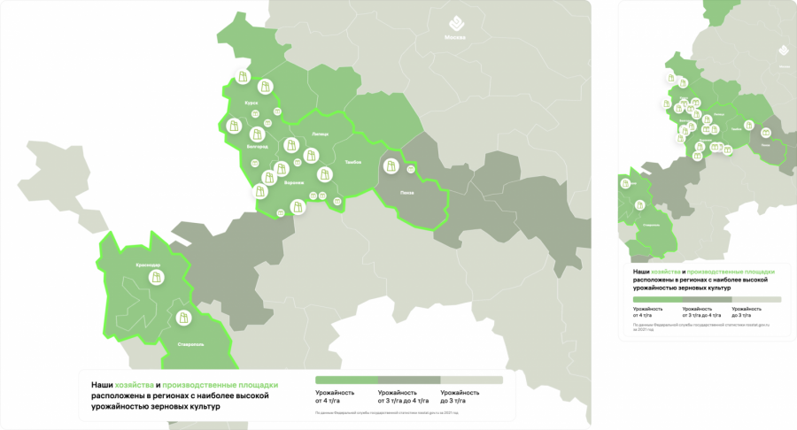 На интерактивной карте представлена инфраструктура компании — элеваторы, заводы и посевные площади.