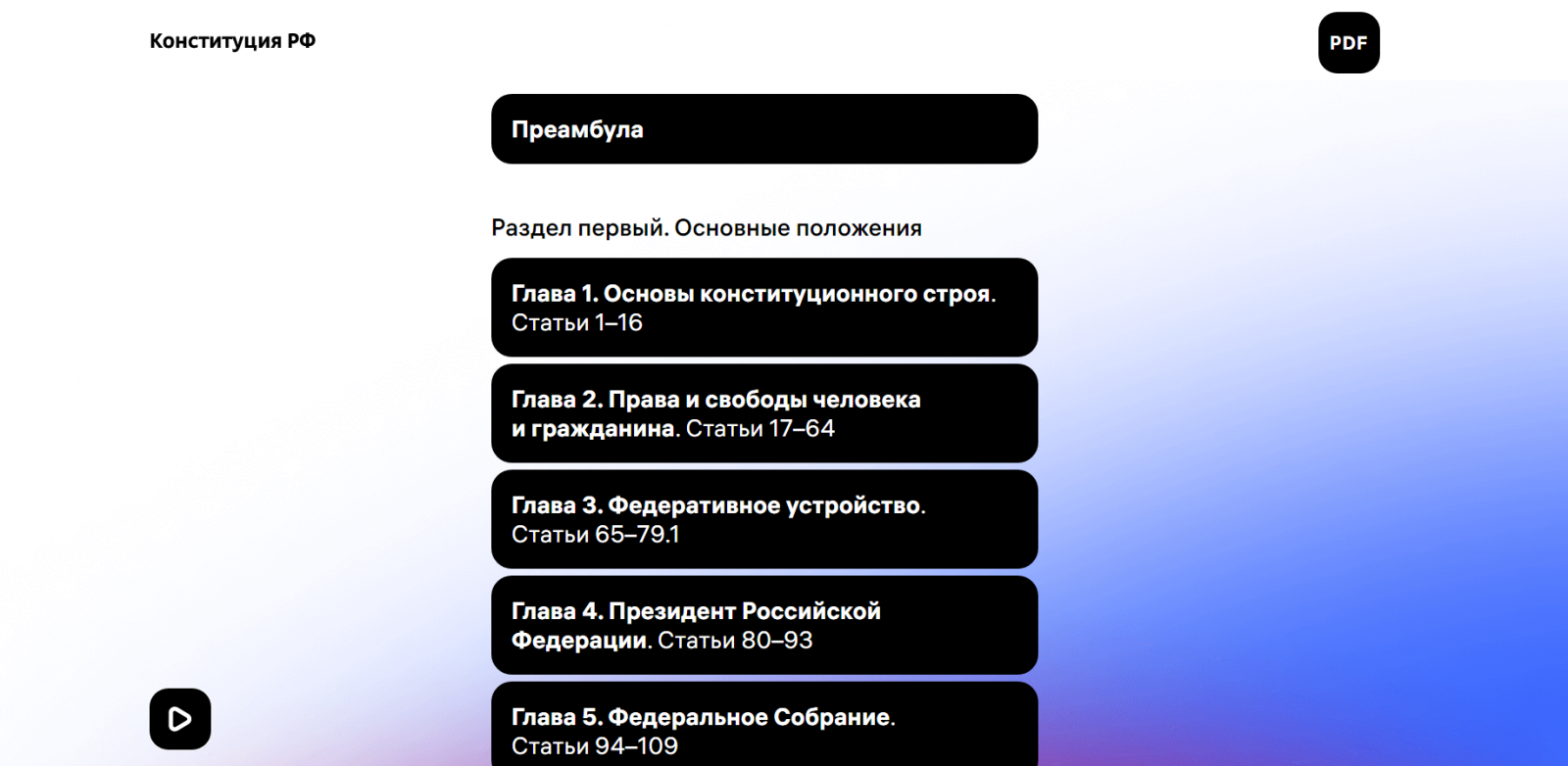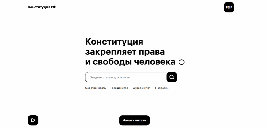 На площадке есть поиск по содержимому, а также PDF-версии для скачивания. Кроме того, сайт адаптирован для людей с нарушениями зрения — постепенно на ресурсе откроется доступ ко всем статьям Конституции с озвучкой.