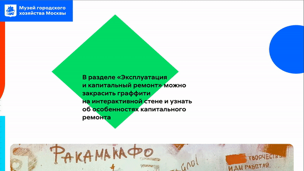 Как пояснили в студии, многие экспонаты на сайте работают точно так же, как и в музее. Так, для очистки виртуальной кирпичной стены, исписанной граффити, посетителю предлагается взять в руки валик и закрасить рисунки.