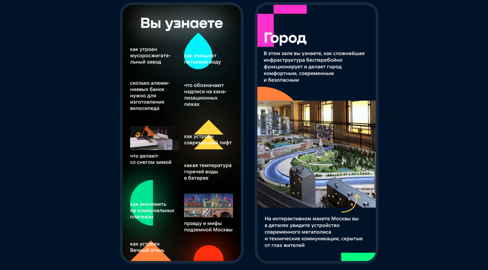 Особенности экспозиций музея проиллюстрированы на сайте трёхмерными моделями. Яркие цвета и формы графических элементов на страницах — это прямые отсылки к интерьерам самого музея, отмечают разработчики.