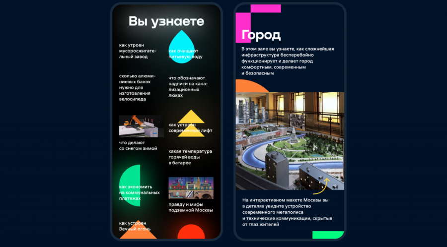 Особенности экспонатов подчеркиваются анимацией. Например, огромная диспетчерская панель выводит инфографику на видеостену отдельными модулями — при скролле они меняются автоматически.