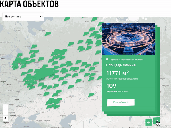 Разделы сайта дополнили интерактивными элементами. Например, для страницы проекта «Жилье и городская среда» создана карта, на которой посетители могут посмотреть информацию об объектах данного нацпроекта. Для каждого разработчики сделали отдельную страницу с описанием особенностей и результатами проделанных работ.