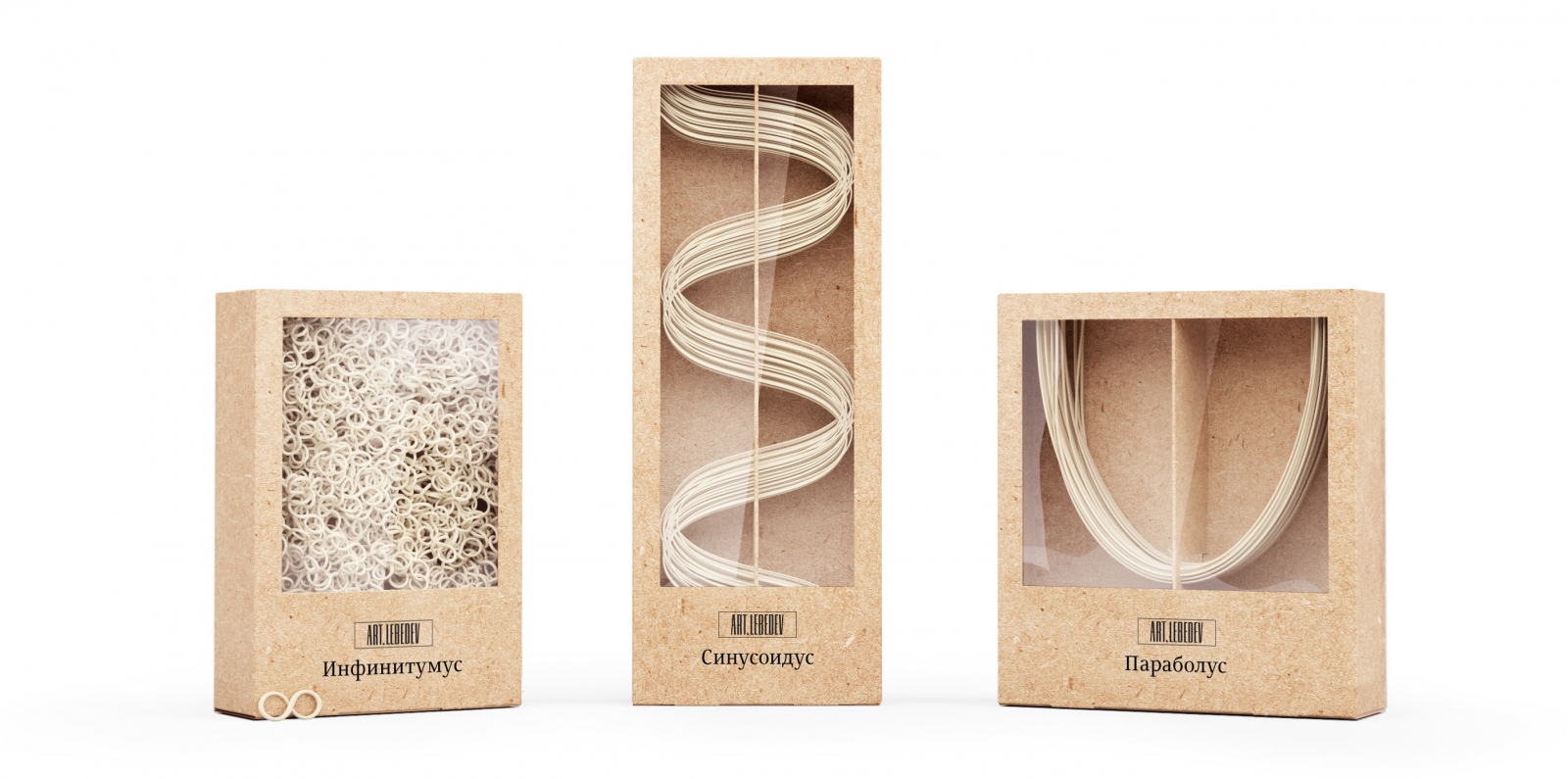 В линейке три вида макарон: в виде синусоиды, параболы и знака бесконечности. Синусоиды и параболы подходят для приготовления спагетти, а знаки бесконечности добавляются в супы.