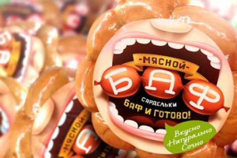 Идея рекламной кампании сарделек «Мясной Баф» разрабатывалась и презентовалась параллельно с концепцией и этикеткой продукта. Ключевым образом стал рот, требующий еды, словно раскрытый клюв голодного птенца.