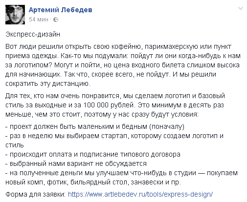 Студия Артемия Лебедева запустила проект «Экспресс-дизайн». Начинающим предпринимателям дизайнеры студии разработают логотип и базовый стиль за 100 тысяч рублей. Стартапы будет выбирать сама студия, а предложенный вариант запрещено обсуждать. О запуске проекта в своем блоге сообщил дизайнер Артемий Лебедев.