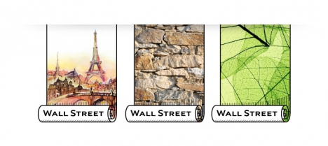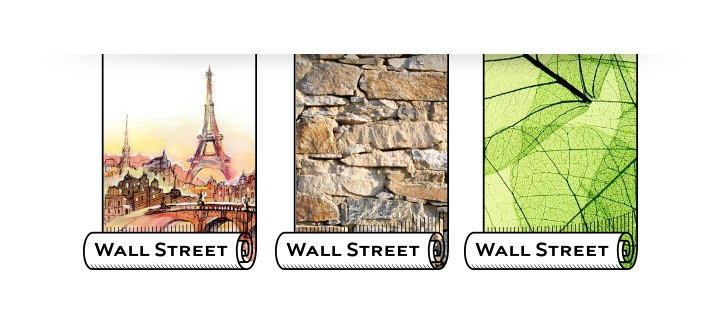 «Уолл-стрит» принимает заказы на фотообои в собственном интернет-магазине, предлагая клиентам выбор материалов, множество готовых изображений и возможность использовать собственные картинки. В Студии для компании разработан логотип, буквально отражающий ее сферу деятельности.