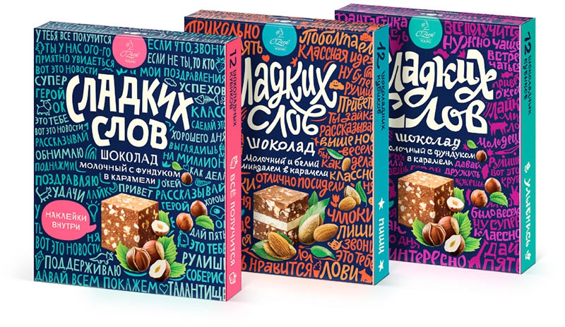 Студия Артемия Лебедева реализовала комплексный проект для молодежного шоколадного бренда «Сладких слов» от фабрики «Озерский сувенир». В ходе сотрудничества креаторы разработали нейминг и дизайн упаковки, которую сложно пропустить на полке.