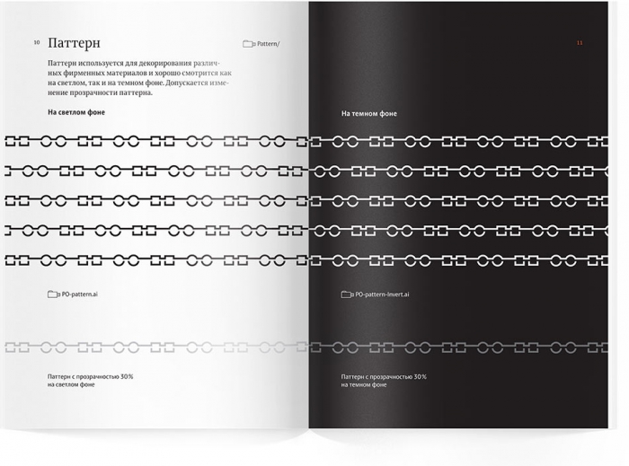 Основным фирменным цветом выбран чёрный. А дополнительный оранжевый будет использоваться в качестве фоновой заливки или для окрашивания паттерна. На тёмной и оранжевом фонах логотип и паттерн будут белого цвета.