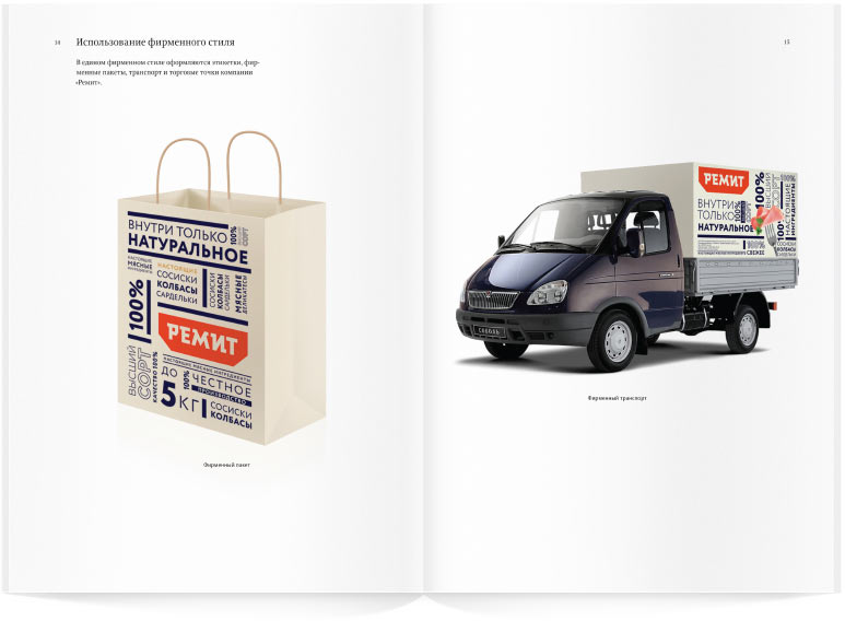 В руководстве по фирменному стилю описано применение логотипов для разных целей и принципов построения шрифтовых композиций, а также правила оформления торговых павильонов, этикеток, пакетов и транспорта.