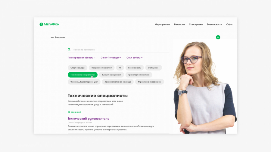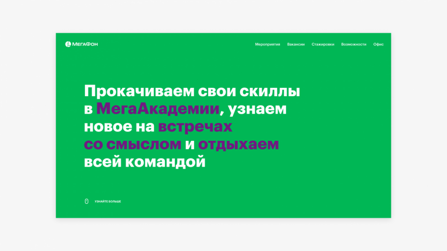 На сайте появились страницы «Возможности» и «Атмосфера». На них собрана информация, посвящённая развитию сотрудников, мероприятиям и стажировкам. Кстати, «МегаФон» нанимает не только состоявшихся специалистов, но и новичков, а затем обучает их на собственной базе и превращает в суперсотрудников.