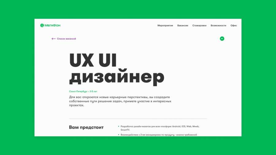 За время совместной работы со «Студией Олега Чулакова» мы создали для нас HR-портал, основная задача которого — помогать соискателям знакомиться с компанией «МегаФон» и откликаться на вакансии напрямую. Проект помогает ознакомиться с перечнем актуальных вакансий и направлений стажировок, совершить 3D-тур по офису, что позволяет почувствовать себя внутри команды.