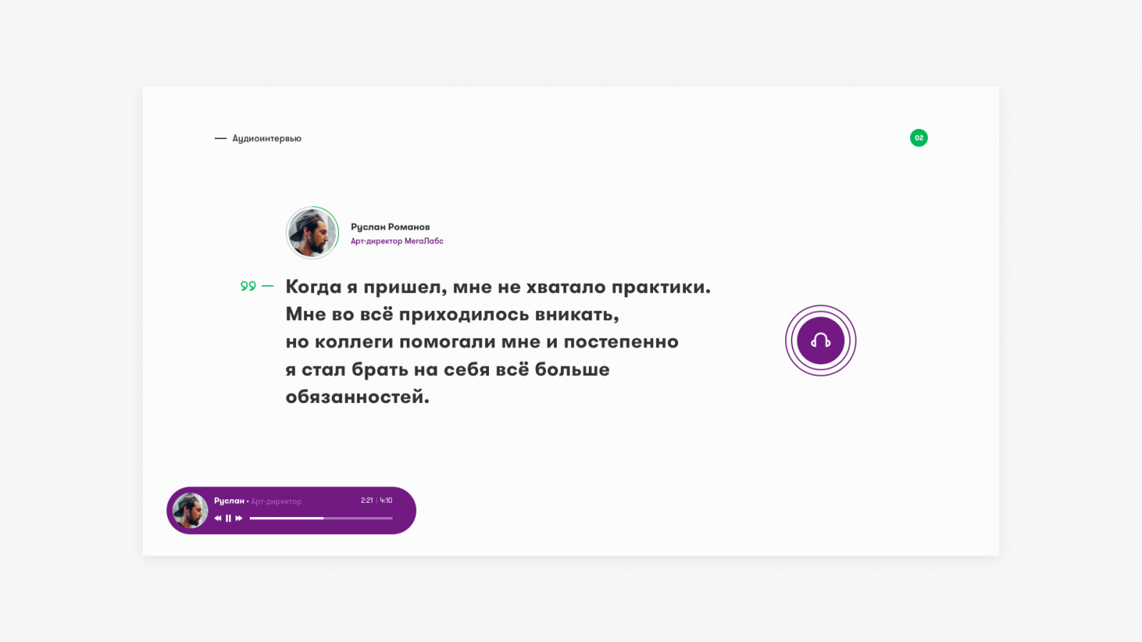 На странице с вакансией был размещен блок с голосовым сообщением. В нем ключевые сотрудники разных направлений рассказывают об особенностях работы в «МегаФоне» и принципах компании. Виджет с аудиоинтервью закрепляется внизу экрана и не прерывается при просмотре контента сайта.