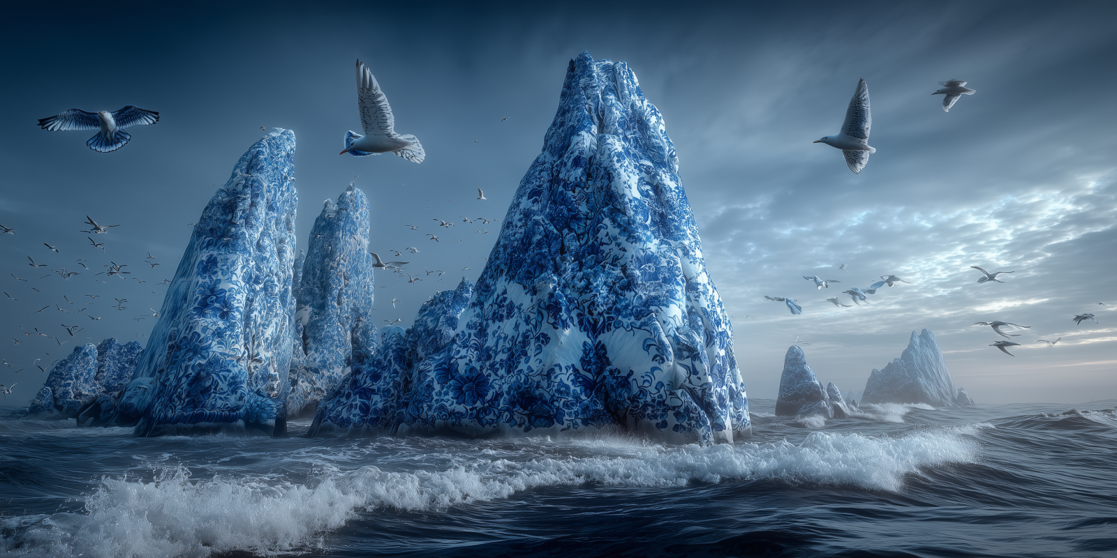 Важным было добиться физически правильных движений океана и сохранить консистентность гжельского узора, чтобы он не «плыл» вместе с объектами. Отдельных готовых референсов не было — все рождалось в процессе.