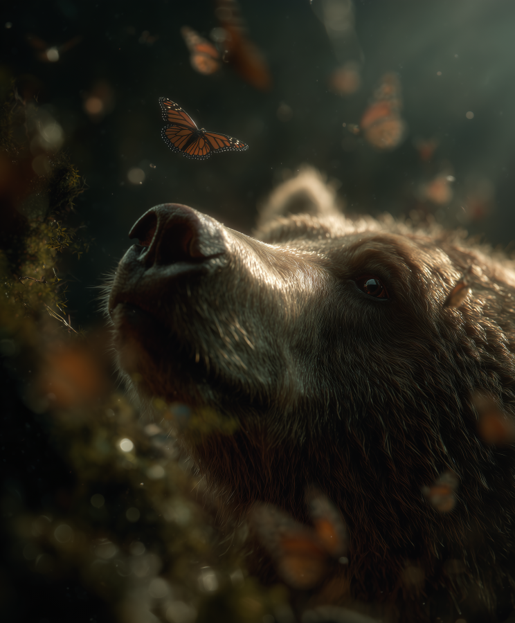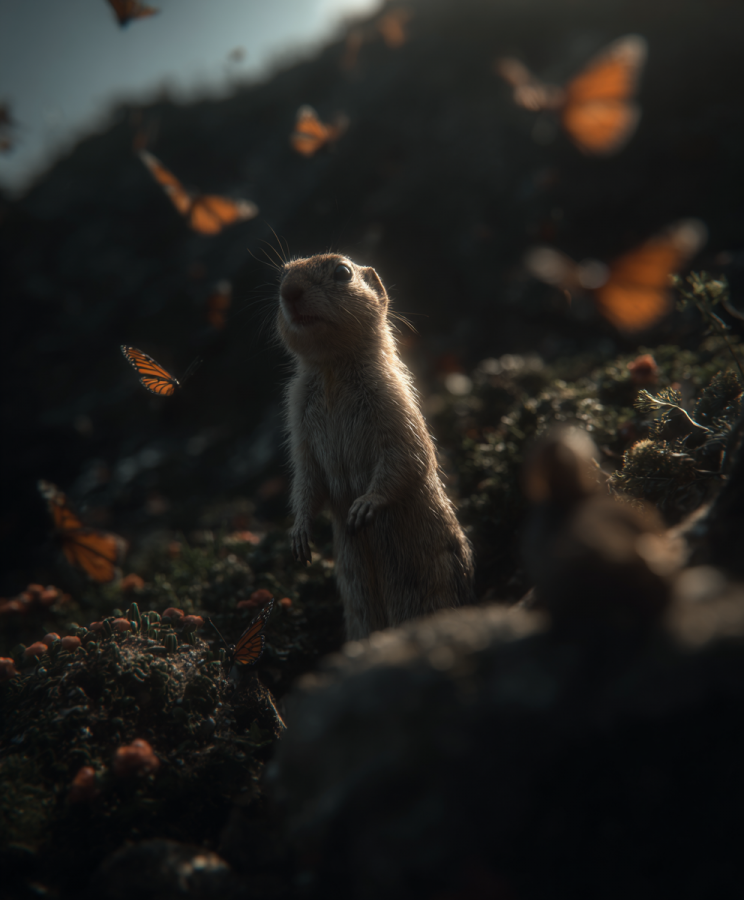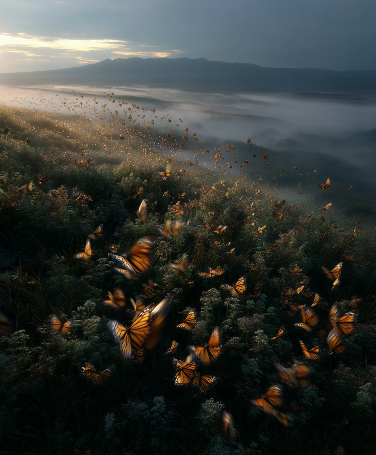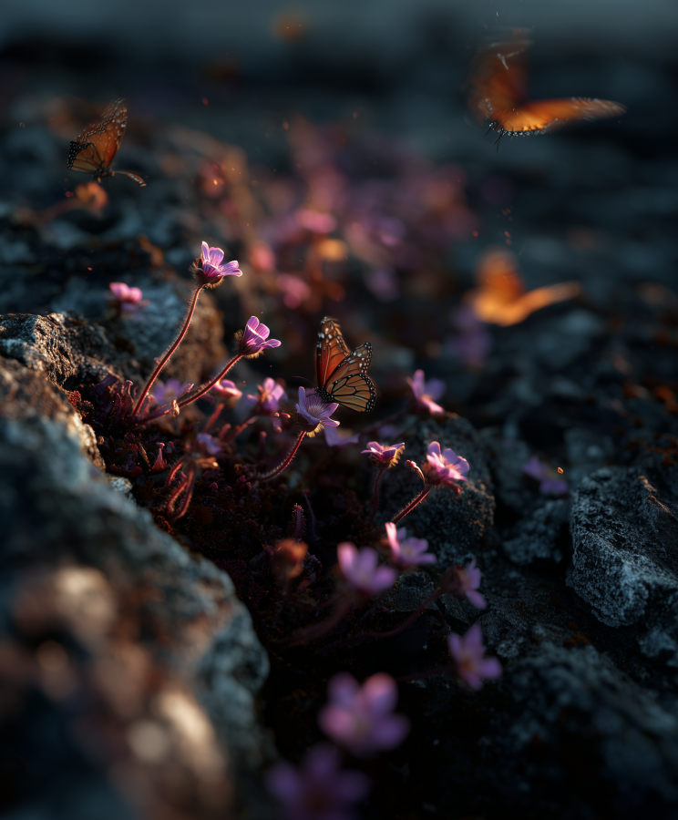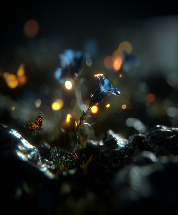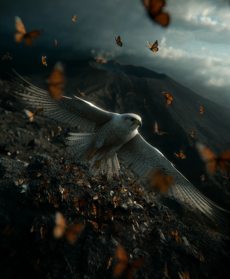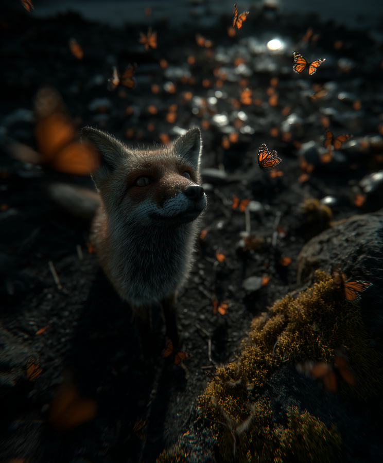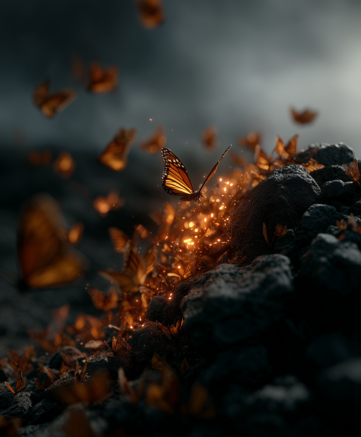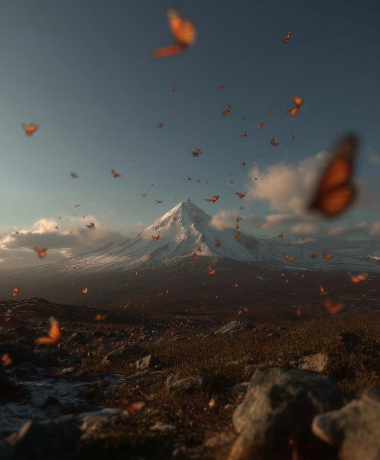 Главный вызов проекта — это физика в анимации. Особенно в сценах вулкана с плотным роем бабочек: важно было сохранить реализм их движения, не уйдя в хаос или излишнюю синхронность.