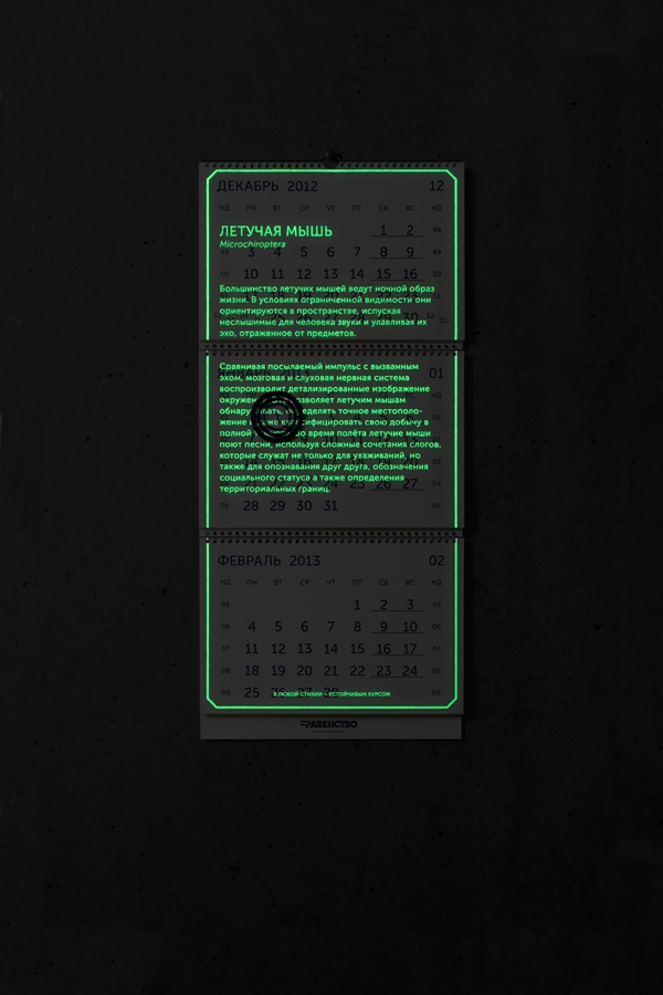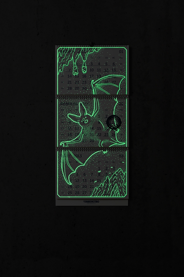 Действительно, на страницах календаря можно увидеть «фосфорических» птиц, рыб, летающих мышей, а из-за нестандартной конструкции просмотр всех животных заранее представляется невозможным.