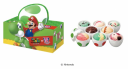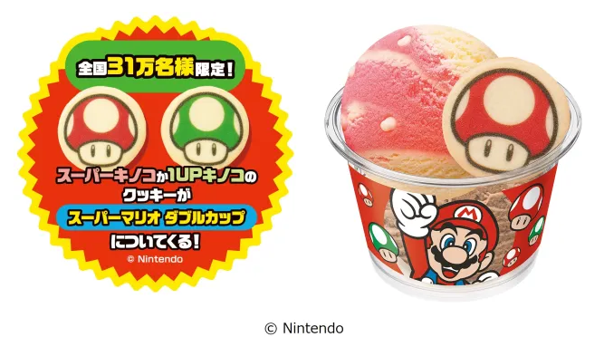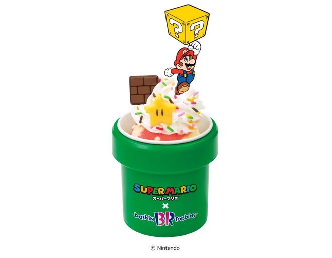 Один из видов мороженного — Кубок Super Mario с тремя дизайнами: красный, желтый и зеленый. Покупатели могут выбрать два своих любимых вкуса для наполнения чашек, которые будут распределены случайным образом. Первые 310 тыс японцев, которые купят чашку, получат либо печенье Super Mushroom, либо печенье Up Mushroom в качестве специальной начинки. Стоимость маленьких чашек — 490 иен (318 руб.), а обычных — 710 иен (461 руб.).