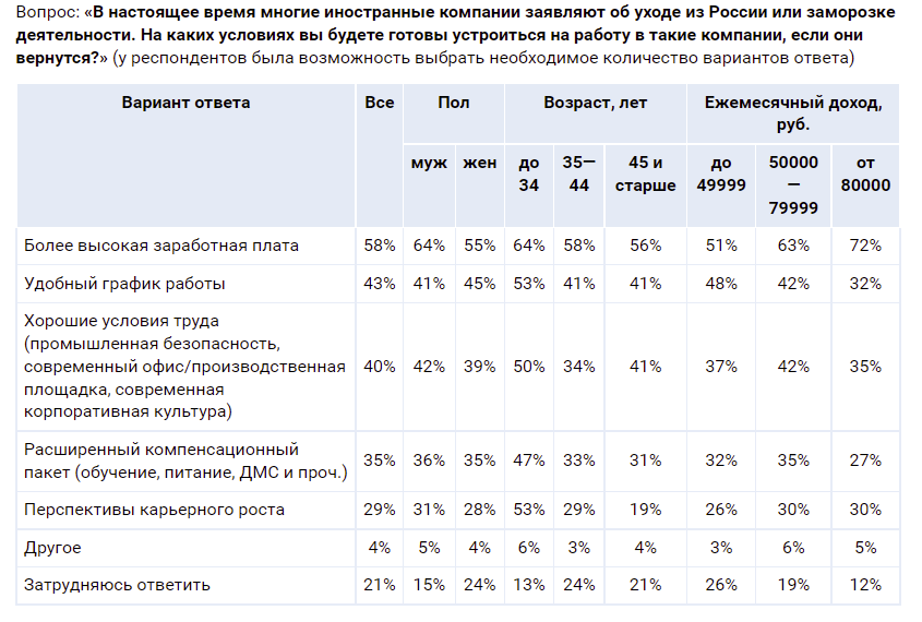 Компаниям, поддержавшим санкции, в случае возвращения придется бороться за кадры. Так, 58% россиян, готовых рассматривать вакансии компаний-перебежчиков, трудоустроятся к ним только на условиях более высокой оплаты труда. Для 4 из 10 решающим фактором станет удобный график или хорошие условия труда. Расширенный компенсационный пакет и перспективы карьерного роста важны для каждого третьего опрошенного. При этом, работать в западных компаниях, вернувшихся на российский рынок, ради больших денег чаще готовы россияне с доходом более 80 тыс. руб., а ради удобного графика — опрошенные с зарплатой менее 50 тыс. руб.