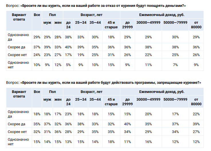 Сами курильщики отмечают, что бросить курить им скорее поможет поощрение, нежели запрет. Так, 29% курильщиков однозначно бросили бы курить, если бы работодатель мотивировал их деньгами, еще 37%, вероятно, бросят курить при наличии программы финансовой поддержки от компании. Однозначно согласны бросить курить при наличии запрещающих программ на работе 18% опрошенных, скорее согласны 35%. Чаще всего готовность бросить курить в ответ на поощряющие и запрещающие программы демонстрировала молодежь до 24 лет.