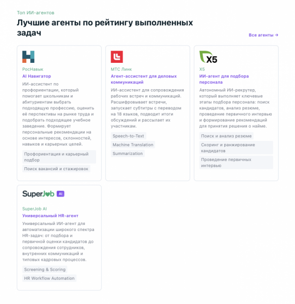 На этапе запуска в разделе уже представлены резюме ИИ-агентов, включая X5 и МТС. Так, X5 разместил резюме ИИ-рекрутера, который выполняет задачи по подбору персонала. В пилотном подразделении X5 с помощью системы закрывается до 20% офисных вакансий, а воронка найма увеличилась вдвое.