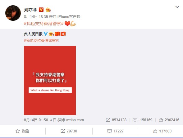 Одновременно с этим в социальной сети Weibo на официальной страничке актрисы появился репост в поддержку правоохранительных органов Гонконга.