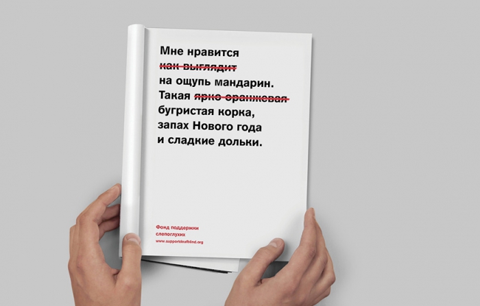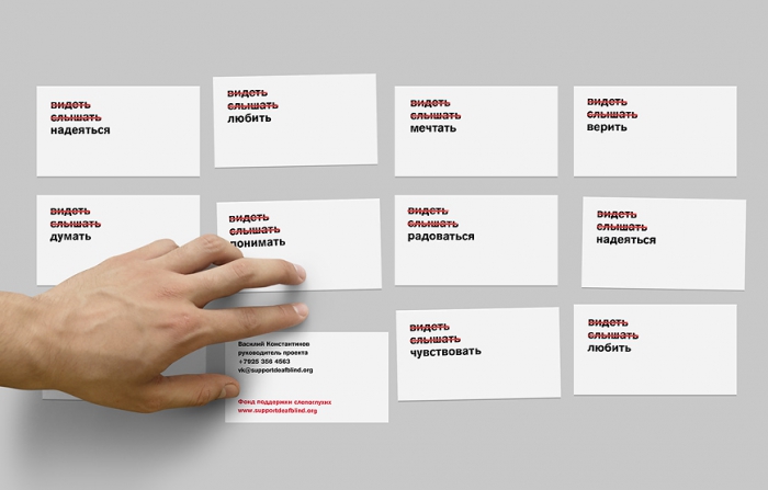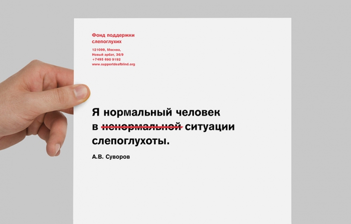 Агентство Suprematika разработало фирменный стиль фонда поддержки слепоглухих, созданного при правительстве РФ весной 2014 года. При создании айдентики креаторы намеренно отказались от знака и сложных визуальных элементов, сосредоточившись исключительно на лаконичном смысловом решении.