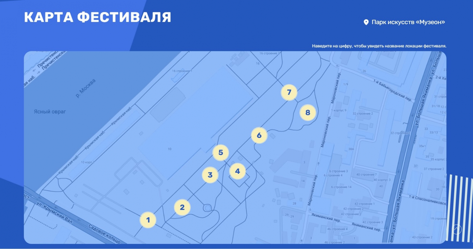 Главными каналами коммуникации стали сайт и Telegram-канал. Для лендинга мы сделали простую, понятную и удобную структуру, чтобы любой пользователь мог быстро изучить информацию о событии. На первом экране разместили короткий шоурил — его сняли и смонтировали в первые дни работы фестиваля, чтобы показать эмоции людей и основные локации. Дизайн получился минималистичным, но с эффектом параллакса фоновых элементов и использованием анимации, которая подчеркнула основной контент.